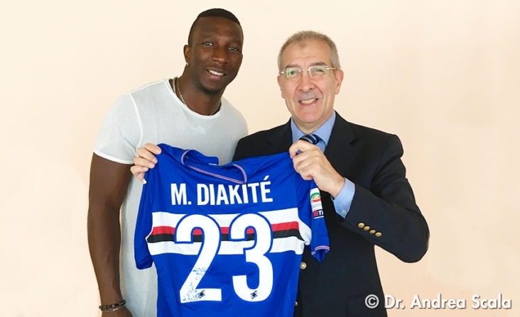 In occasione della visita di controllo e della radiografia dopo l’intervento il dottor Andrea Scala riceve la maglia della Sampdoria dal giocatore Modibo Diakitè.