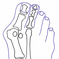 Lo schema mostra che l’alluce è deviato lateralmente (valgo). Colpisce maggiormente la “cipolla” costituita dalla sporgenza sotto la pelle della testa del 1° metatarsale; urta contro la scarpa e causa infiammazione e dolore.