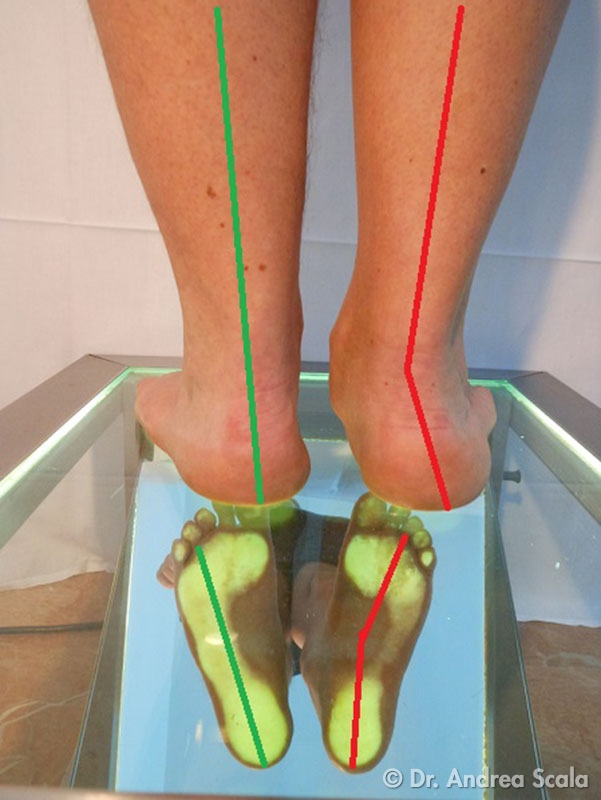 La foto mostra la differenza tra il piede sano (linea verde) e il piede piatto pronato (linea rossa spezzata), si nota il crollo dell’arco interno del piede, la sporgenza del piede verso l’interno e la deviazione in valgo del calcagno.