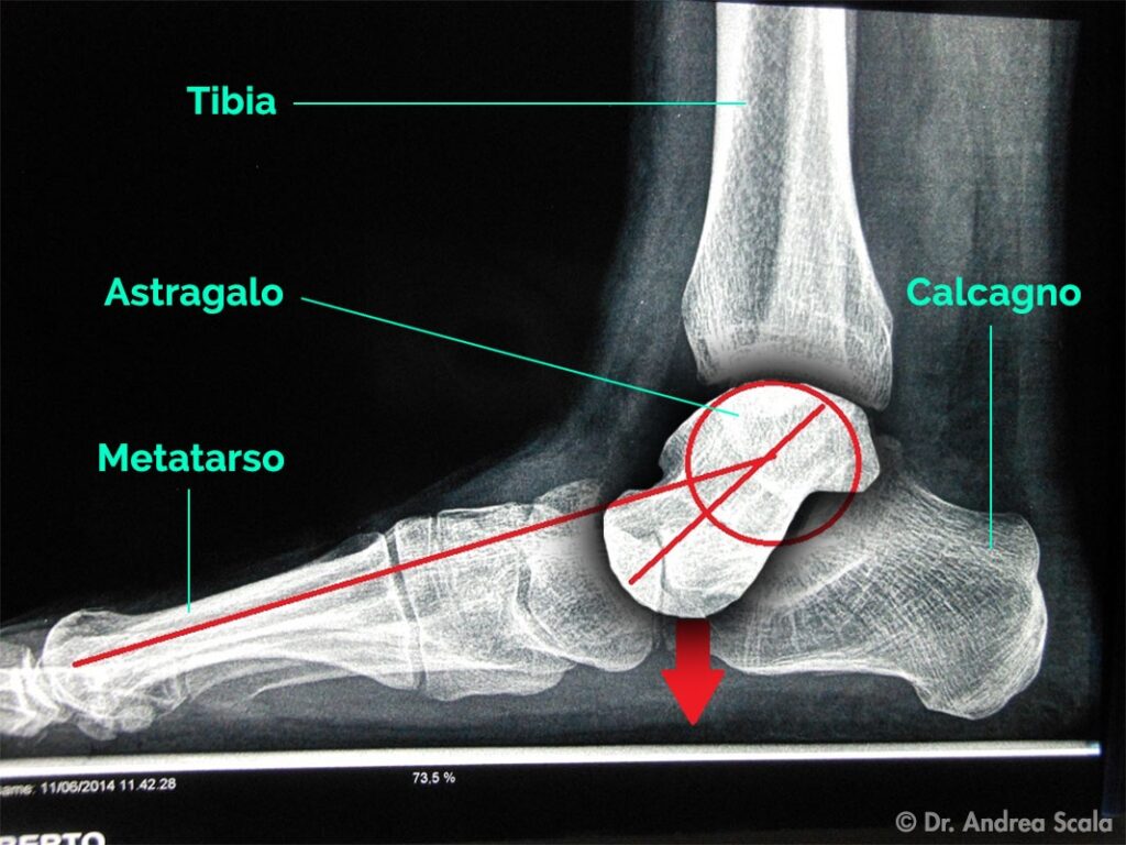 La radiografia pre-operatoria mostra il crollo dell’arco interno del piede. La freccia rossa indica che l’ astragalo crolla verso il suolo (piede valgo pronato). La linea rossa che viene dal metatarso è spezzata e dimostra che il piede è praticamente rotto in due parti: anteriore (avampiede) e posteriore (retropiede).
