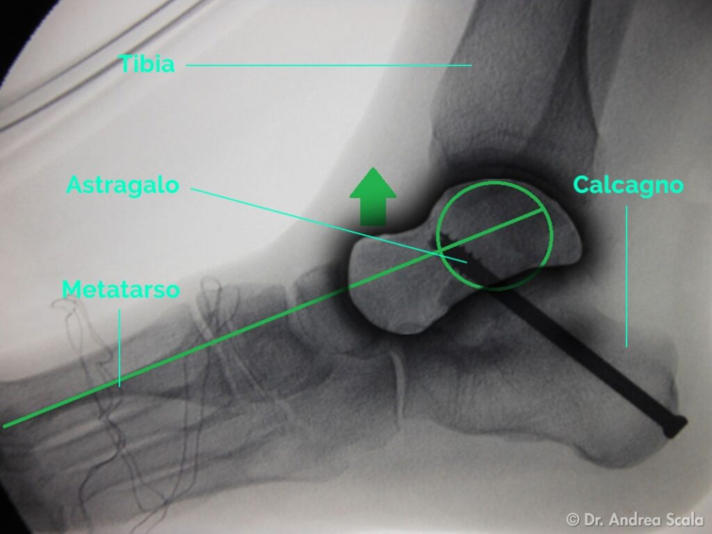 La radiografia post-operatoria mostra che l’arco interno del piede è stato sollevato. La freccia verde indica che l’astragalo guarda verso l’alto. La linea verde che viene dal metatarso continua con l’astragalo e dimostra che il piede ha ricostruito il normale allineamento tra le due parti: anteriore (avampiede) e posteriore (retropiede).